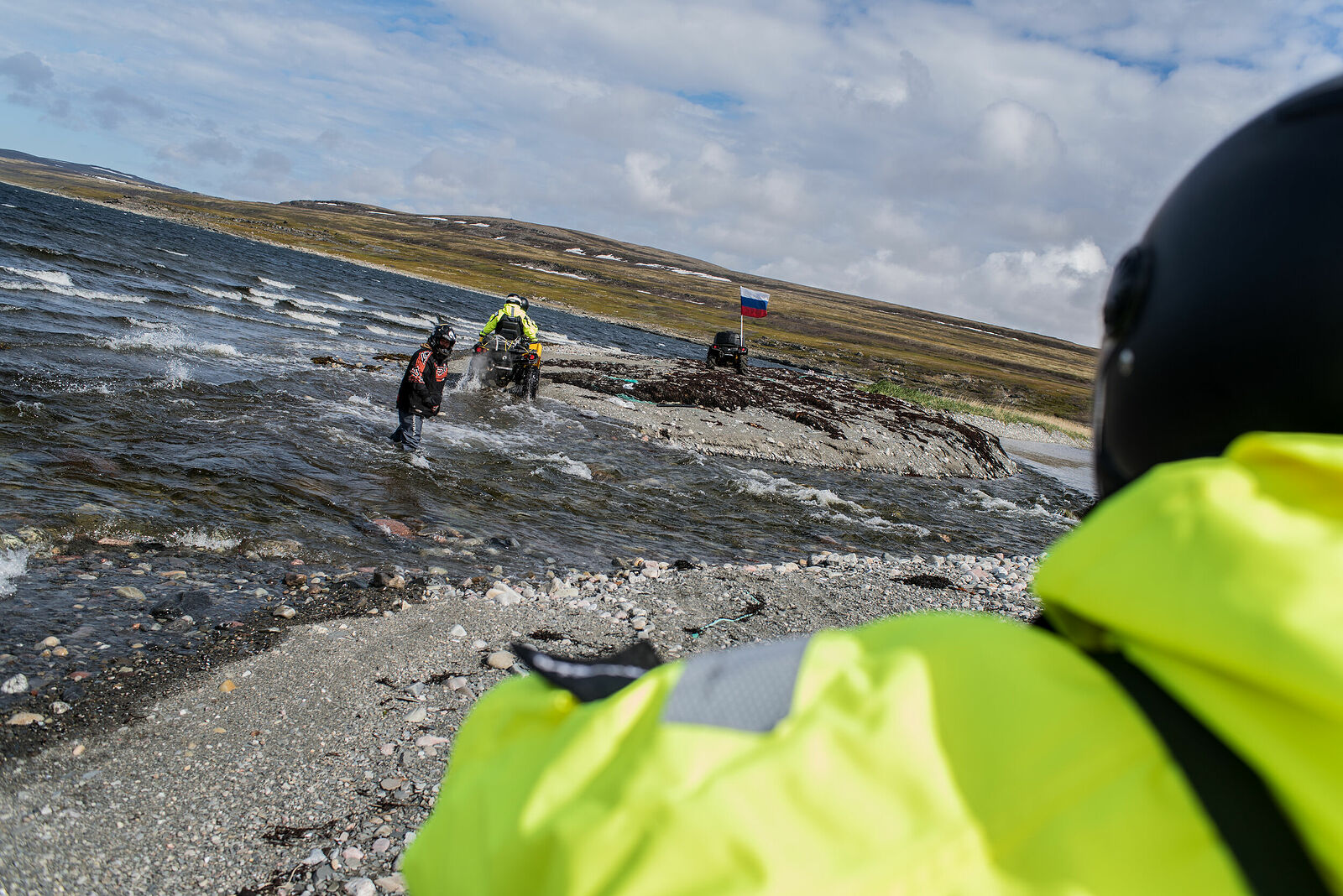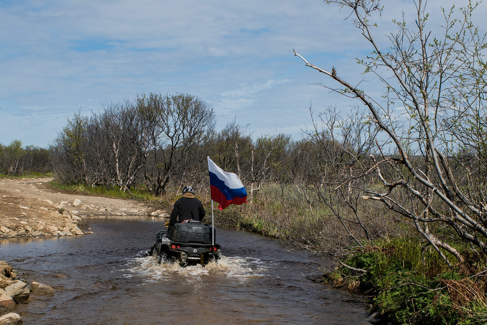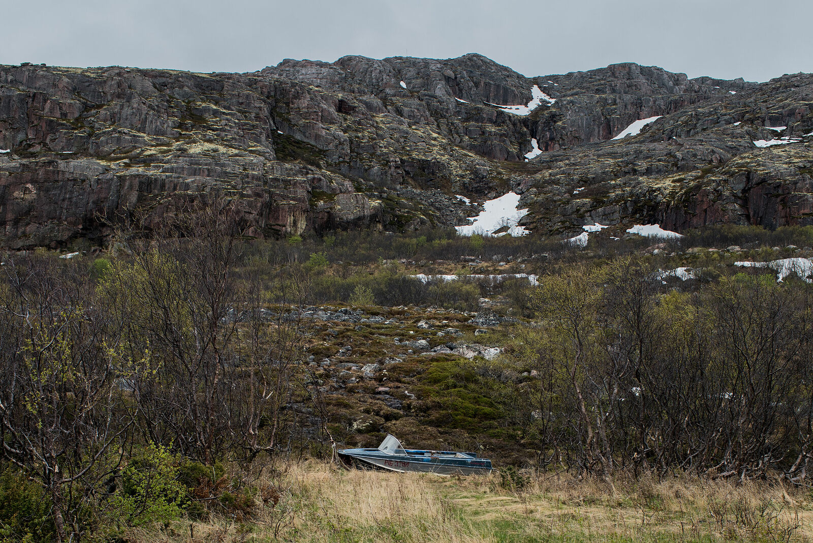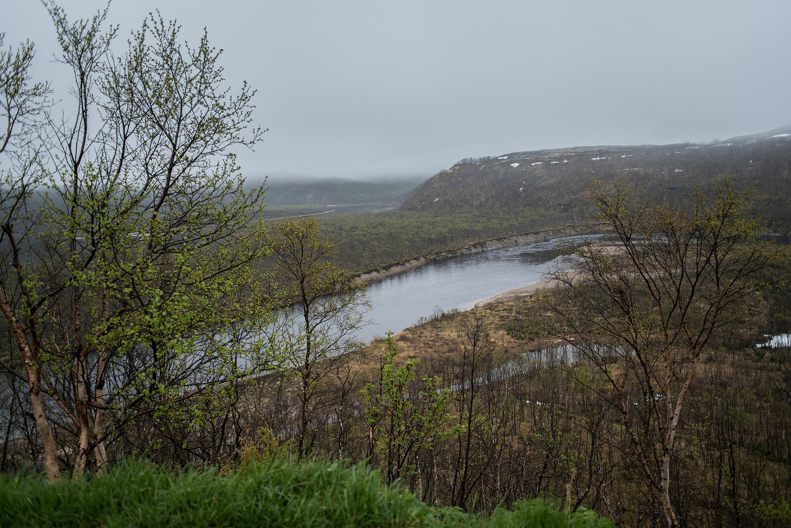 The road along the swift Titovka meanders through the taiga, where in some places the June snow from winter still remains on the slopes
